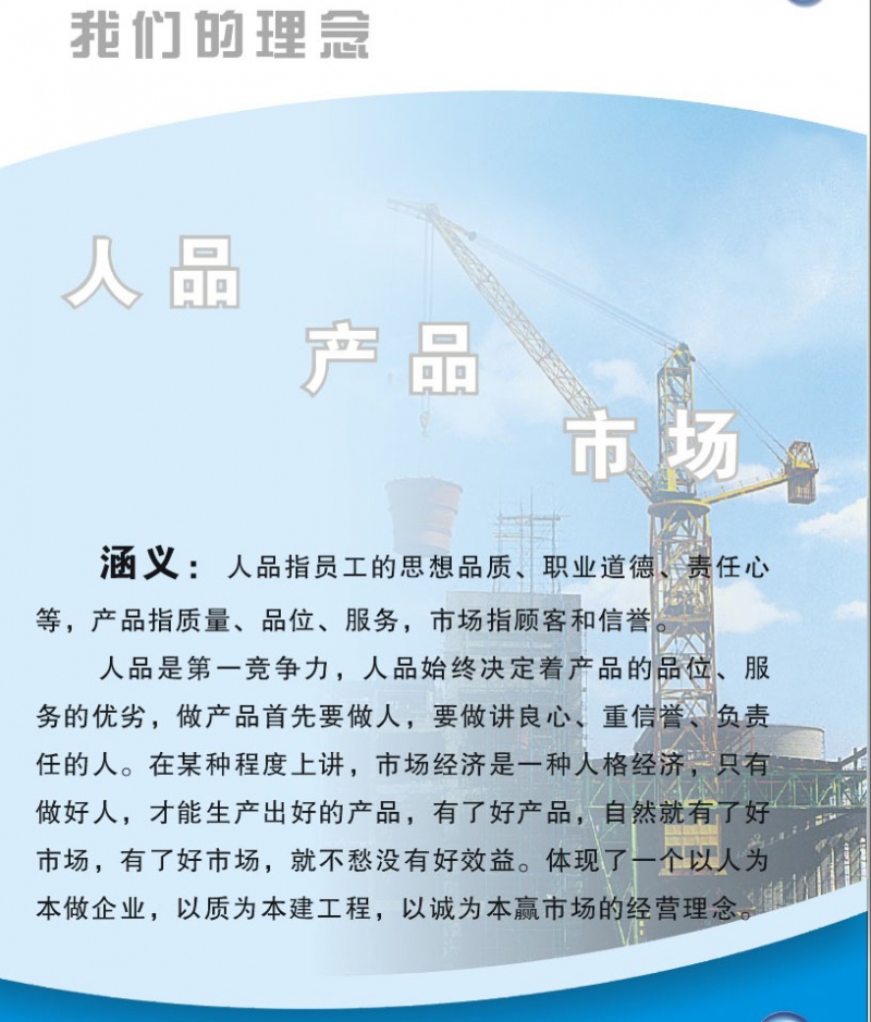 人品是第一競爭力,人品始終決定著(zhù)產(chǎn)品的品位,服務(wù)的優(yōu)劣,做產(chǎn)品首先要做人,要做講良心、重信譽(yù)、負責任的人,在某種程度上講,市場(chǎng)經(jīng)濟是一種人格經(jīng)濟,只有做好人,才能生產(chǎn)出好的產(chǎn)品,有了好產(chǎn)品,自然就有了好市場(chǎng),有了好市場(chǎng),就不愁沒(méi)有好效益。體現了一個(gè)以人為本做企業(yè),以質(zhì)為本建工程,以誠為本贏(yíng)市場(chǎng)的經(jīng)營(yíng)理念。