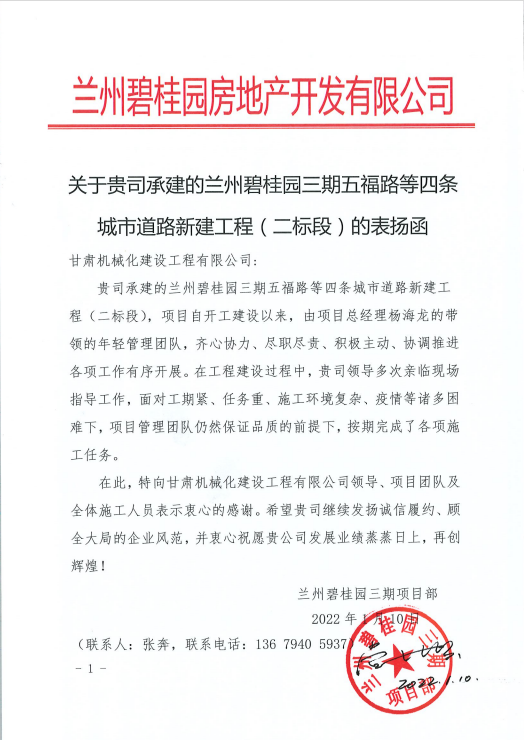 1月10日,我公司收到來(lái)自蘭州碧桂園房地產(chǎn)開(kāi)發(fā)有限公司的表?yè)P函,函中提到,蘭州碧桂園三期五福路等四條城市道路新建工程(二標段)項目自開(kāi)工建設以來(lái),項目人員面對工期緊、任務(wù)重、施工環(huán)境復雜、疫情等諸多困難,在保證品質(zhì)的前提下,按期完成了各項施工任務(wù),提出表?yè)P。
