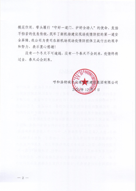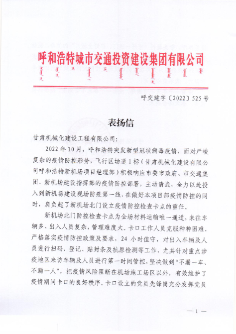 2022年12月7日,呼和浩特市交通投資建設集團有限公司給我司發(fā)來(lái)表?yè)P信,表?yè)P信中充分肯定了我司呼和浩特新機場(chǎng)項目部在疫情防控工作上作出的努力,展現了我司的社會(huì )責任與擔當。