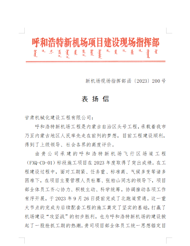 2023年9月28日,呼和浩特新機場(chǎng)項目建設現場(chǎng)指揮部給我司發(fā)來(lái)表?yè)P信,信中充分肯定了我司在呼和浩特新機場(chǎng)項目建設中項目部全體員工統一思想錨定目標、精心組織管理、發(fā)揚艱苦奮斗、迎難而上、攻堅克難的鐵軍精神,合理調配資源、強化安全質(zhì)量管理,圓滿(mǎn)完成了指揮部下達的各項施工任務(wù)。
