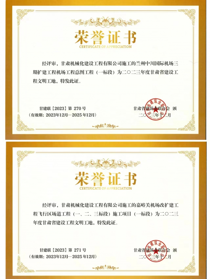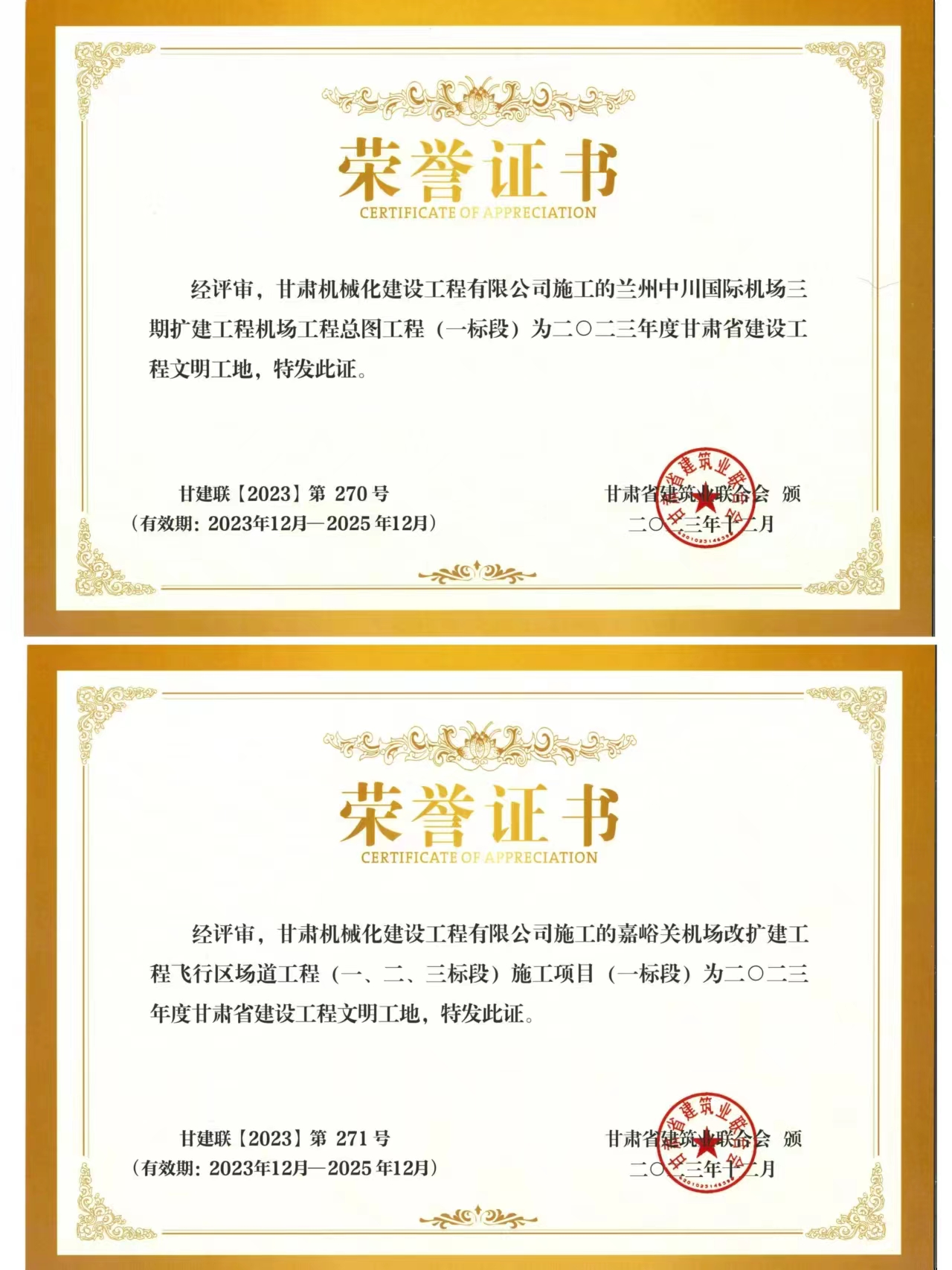近日,我司承建的蘭州中川國際機場(chǎng)二期擴建工程機場(chǎng)工程總圖工程 (一標段)與嘉峪關(guān)機場(chǎng)改擴建工飛行區場(chǎng)道(一、二、三標段) 施工項目 (一標段) 獲得2023年度甘肅省建設工程文明工地榮譽(yù)稱(chēng)號。