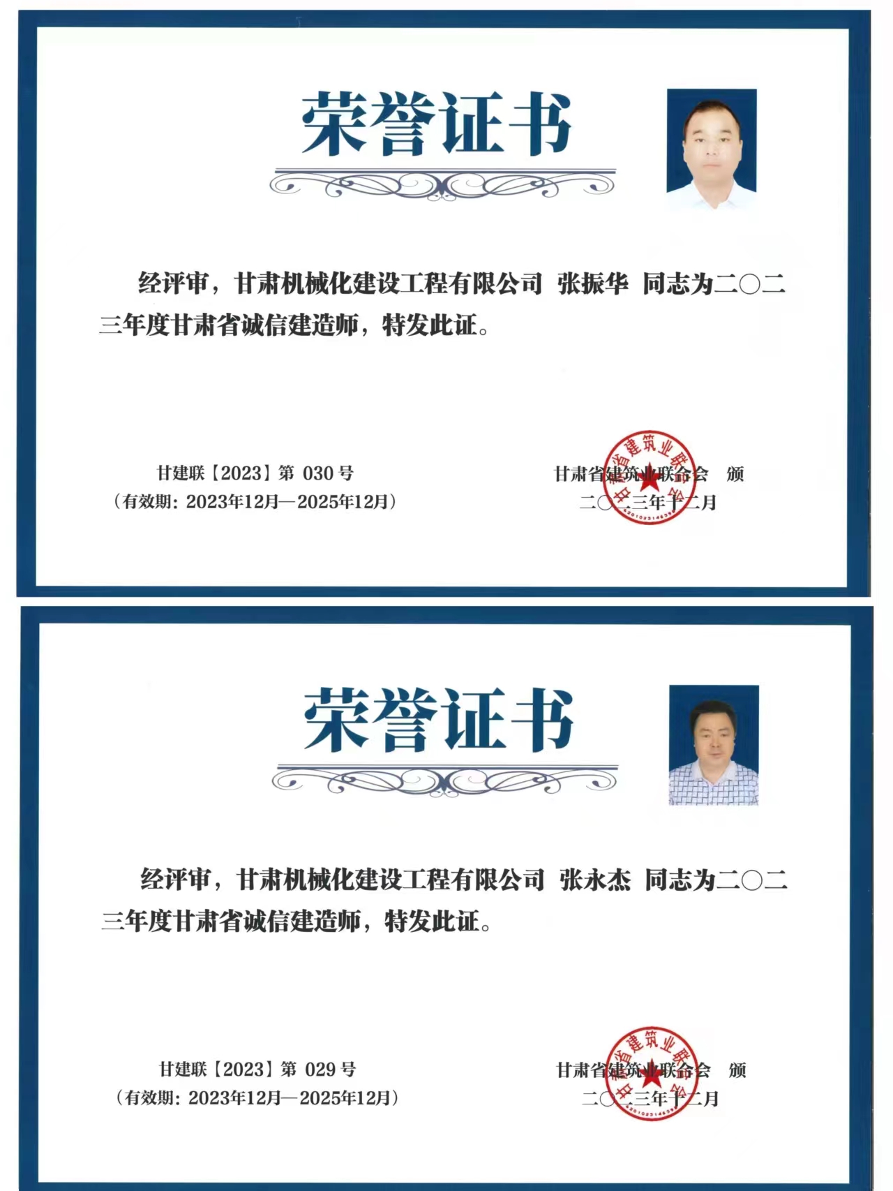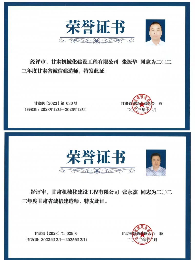 張永杰與張振華兩位同志獲得2023年度甘肅省誠信建造師榮譽(yù)稱(chēng)號。